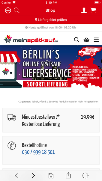 MeinSpätkauf, Berlin'de yaşayanlar için özel bir online alışveriş hizmetidir. Uygulama, kullanıcıların gıda ürünleri, içecekler, alkol, ev eşyaları, sigara ve daha fazlasını sipariş etmelerine olanak tanır. Siparişler, 19,99€'luk minimum sipariş limiti ile kolayca verilebilir ve tabakalar hariç tutulur. Ürünler, 45 dakika içinde ücretsiz olarak kapınıza teslim edilir.